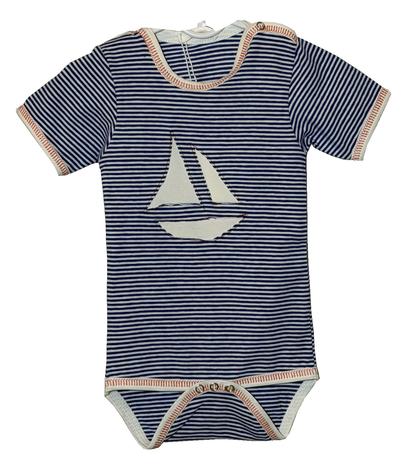 Baby body kratki rukav bijelo plave pruge 3 mm is motivom jedrilice