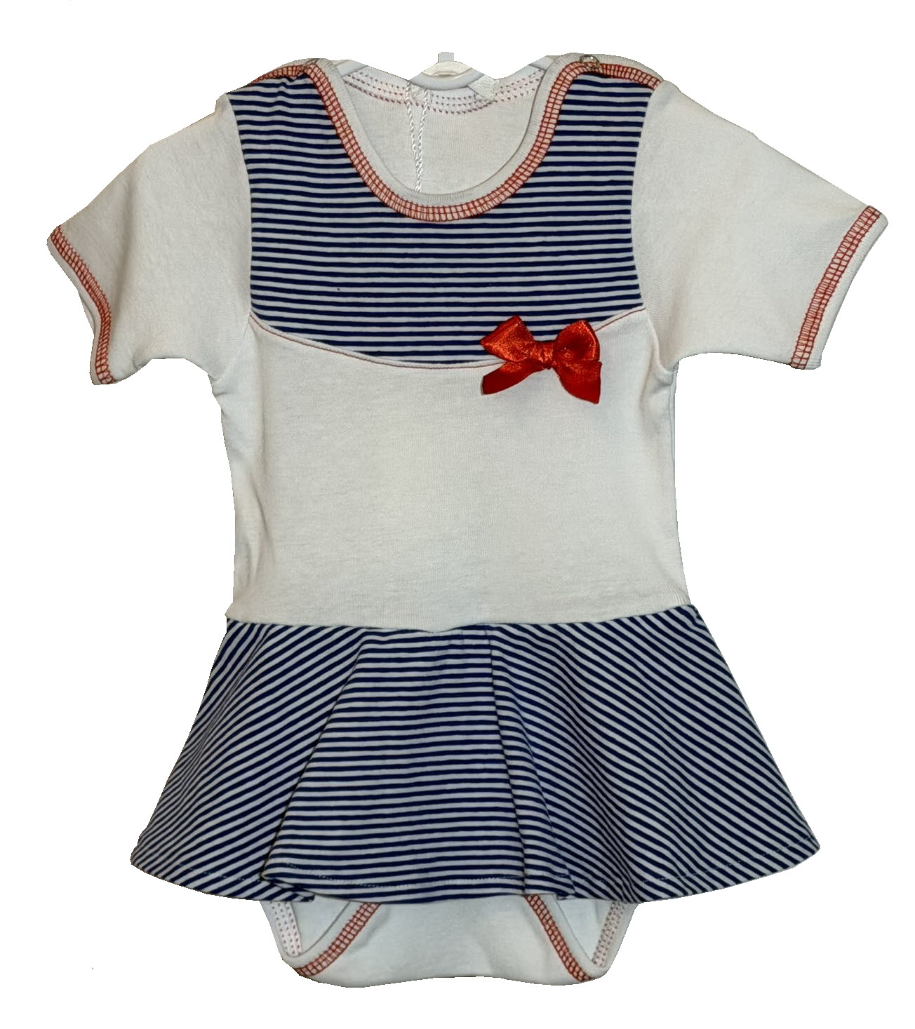 Baby body haljina kratki rukav bijelo plave pruge, prednjica natur i crvena mašna