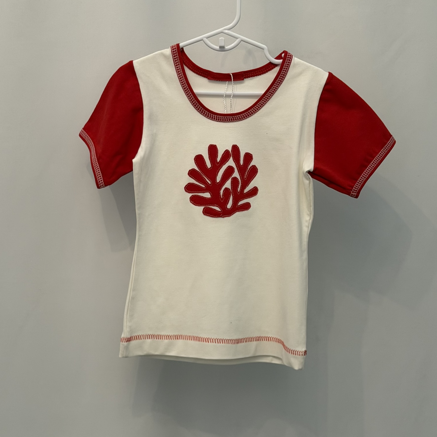 Mekana dječja ženska majica s motivom koralja, natur bijele boje i crvenim rukavima . Dostupna u veličinama 92–140 cm.