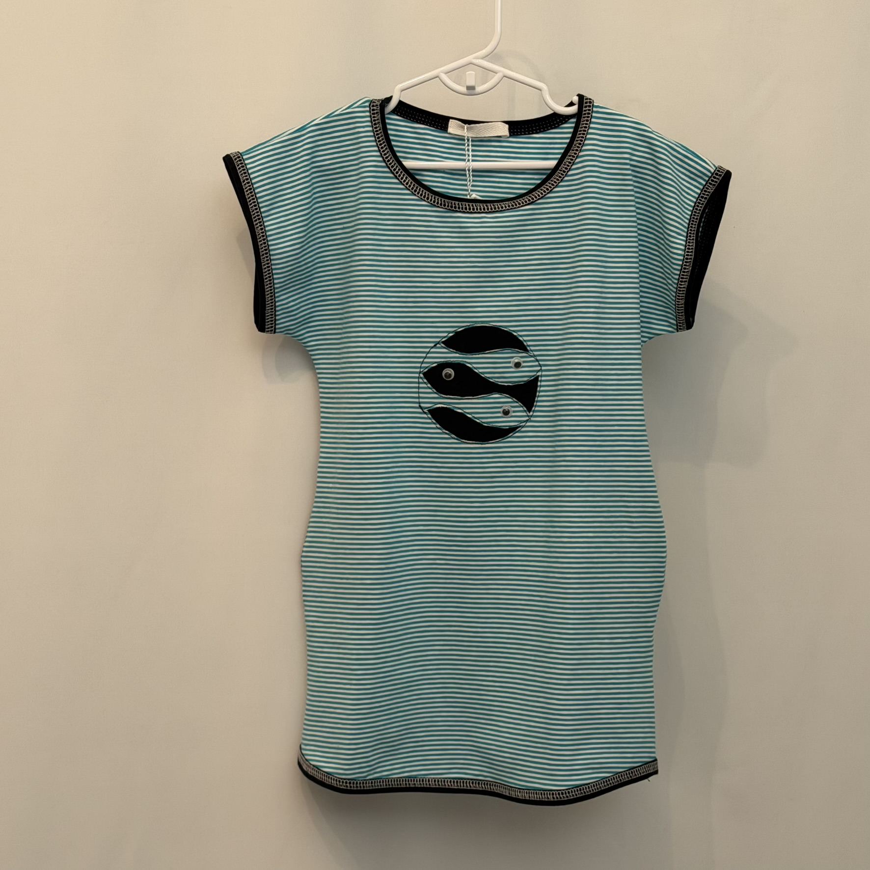 Mekana dječja haljina s motivom ribe, tirkizne i bijele sitne pruge, bočni džepovi . Dostupna u veličinama 92–140 cm.