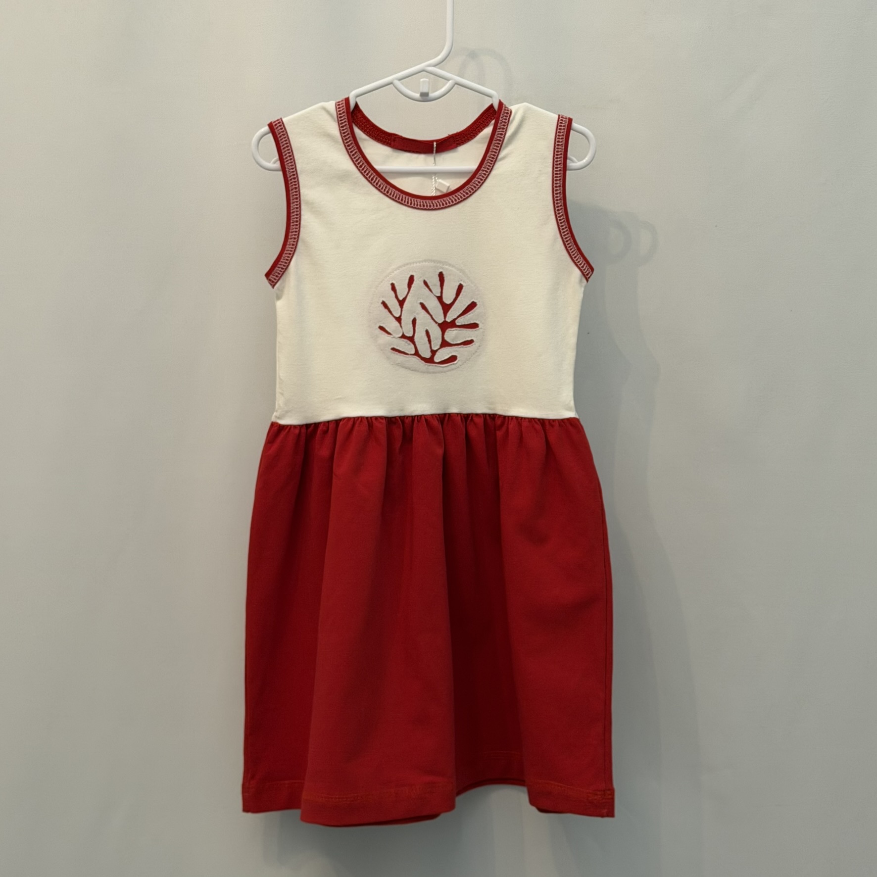 Mekana dječja haljina s motivom koralja, donji dio crveni, gornji natur boje. Dostupna u veličinama 92–140 cm.